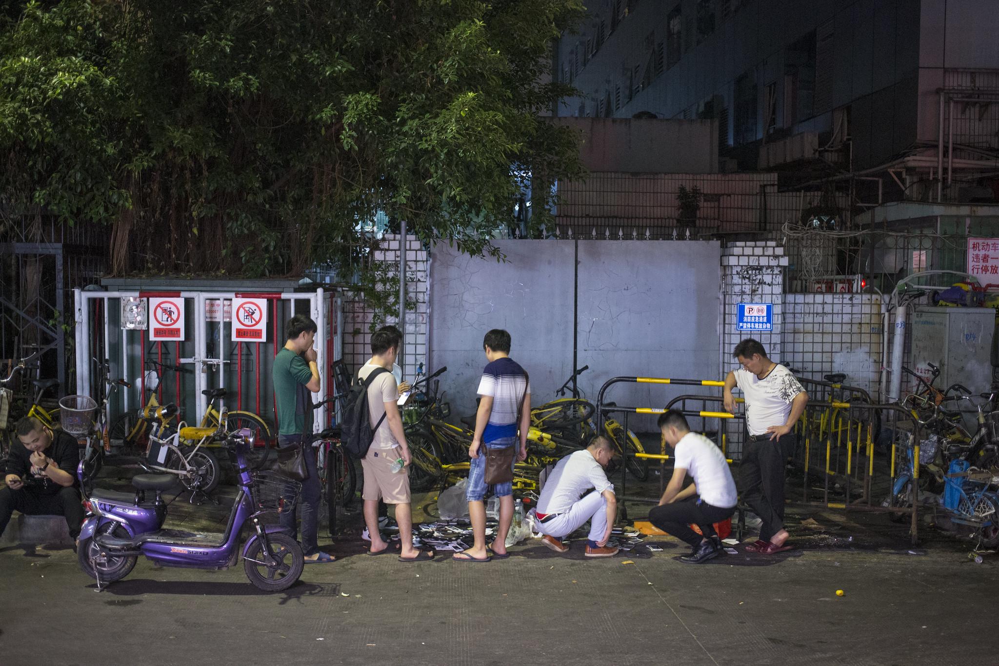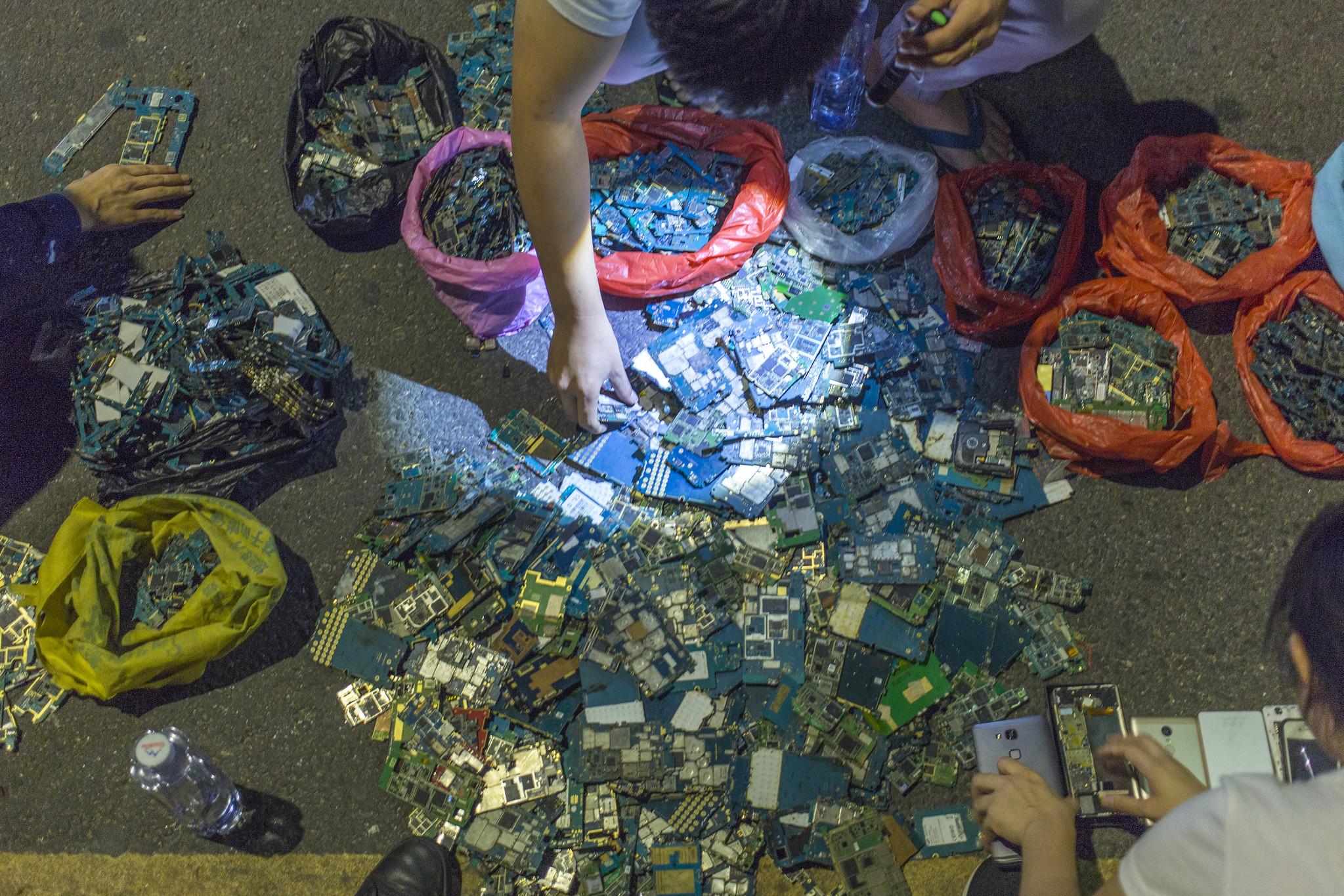 Just around the corner on Aihua Road, there are several malls. One specializes in recycling cell phones. The other is the largest second-hand phone market in Shenzhen. Here, at night, the residue of these formal marketplaces finds its way to the street and into the backpacks of the many eager customers. To navigate under the veil of darkness requires at least a torch, but to inspect the quality of the piles of phones and logic boards available from the street vendors requires more specific tooling. Amidst the hot and noisy crowds, numerous customers carry devices closely resembling something wielded by ghost hunters, taking readings of electromagnetic fields.